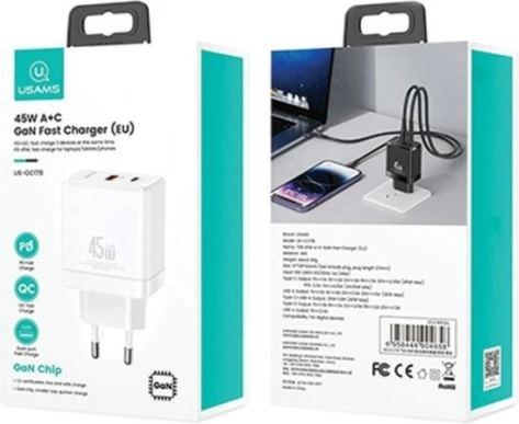 Punjač USAMS US-CC178 nudi dva različita USB priključka, zahvaljujući čemu podržava protokole brzog punjenja poput QC3.0, AFC i FCP, što osigurava kompatibilnost s modelima marki Huawei, Apple, Xiaomi, Honor, OPPO, Samsung i drugih. Visoka izlazna snaga omogućuje punjenje većih uređaja poput prijenosnih računala – primjerice, MacBook Air može se napuniti za manje od dva sata!