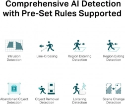 - Klasifikacija ljudi i vozila, pametna detekcija (linija, područje), analiza i brzo pretraživanje