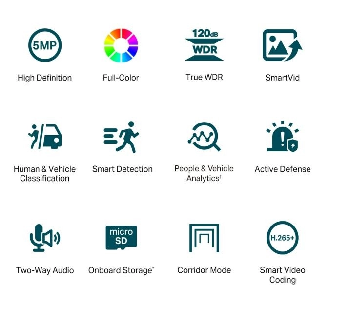 Kamera TP-Link VIGI C450 donosi iznimno finu 5MP rezoluciju i punokolorno noćno gledanje zahvaljujući osjetljivom senzoru i integriranim spot LED diodama. Napredne SmartVid tehnologije poput True WDR, Smart IR i 3D DNR značajno poboljšavaju sliku u zahtjevnim scenama i osiguravaju čitljive detalje za profesionalni nadzor.
