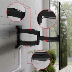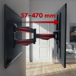 Ovaj izdržljivi zidni nosač omogućuje praktično postavljanje televizora u dnevnoj sobi, spavaćoj sobi ili radnom prostoru. Zahvaljujući dvostrukoj zglobnoj ruci lako izvučete TV od zida 57–470 mm, zakrenete ga u željeni kut i nagnite u rasponu +2° do -12° za savršen pogled bez odsjaja.