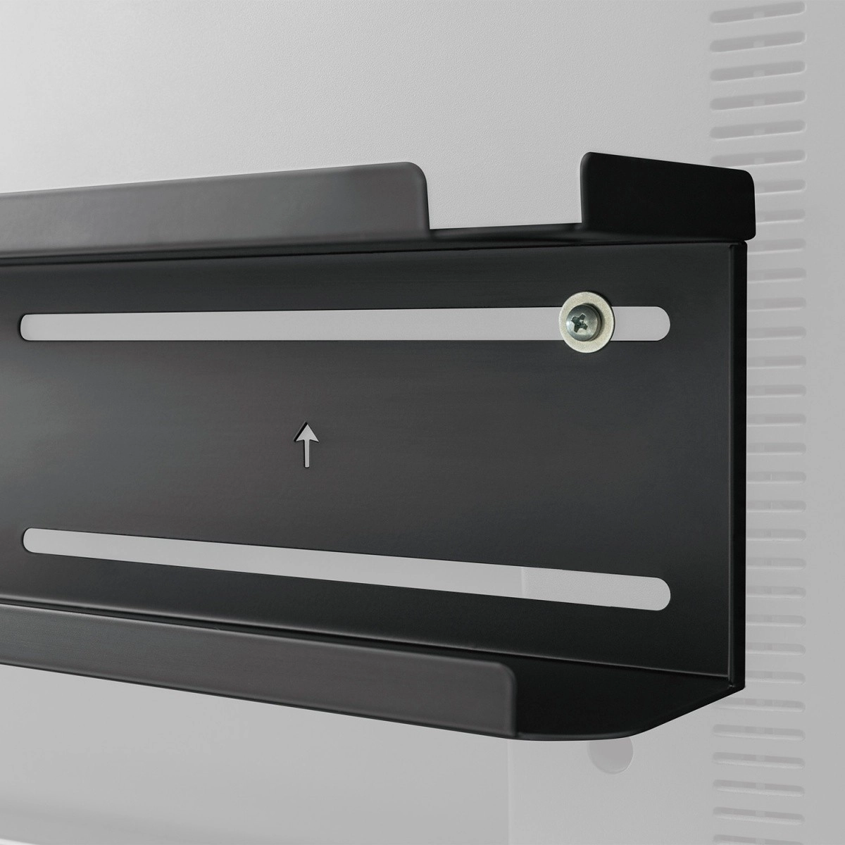 Polica 2 u 1 s dvjema mogućnostima montaže: na zid ili na stražnju stranu televizora. Polica se sastoji od dvije razine – gornja polica dodatno ima protukliznu podlogu koja još bolje štiti odlagane predmete od klizanja i pada. Univerzalan dizajn lako se uklapa u bilo koje okruženje. Uz ovu odlagalnu policu lakše je organizirati prostor oko televizora. Velika površina pruža dovoljno mjesta, među ostalim, za ruter, daljinski upravljač za TV, razdjelnik napajanja i druge predmete. Maksimalno opterećenje police je 2 kg.