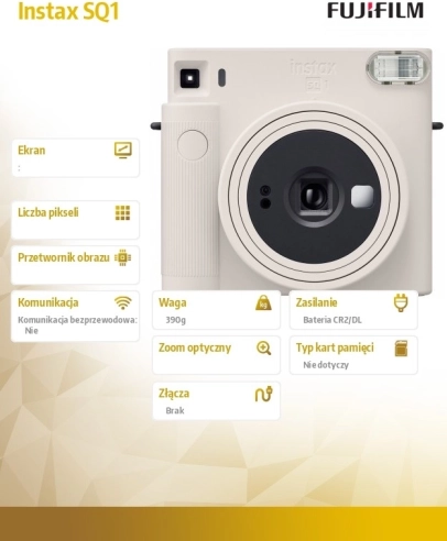 Fujifilm Instax SQ1 osmišljen je za one koji žele zabilježiti spontane trenutke uz jednostavno rukovanje i kompaktan dizajn. Opremljen je objektivom žarišne duljine 65,75 mm i otvorom blende f/12,6, što omogućuje fotografiranje već od udaljenosti 30 cm. Poseban selfie način s integriranim zrcalcem olakšava snimanje autoportreta. Kamera koristi Instax SQUARE filmove i napaja se s dvije CR2 baterije, što omogućuje snimanje otprilike 30 pakiranja filma s po 10 snimaka.
