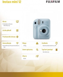 Fotoaparat Instax Mini 12 osmišljen je tako da svaki trenutak uhvaćen vašim objektivom može biti odmah ispisan. Njegov kompaktan dizajn uključuje snažnu bljeskalicu i uvlačni objektiv, koji omogućuje snimanje izvrsnih fotografija u različitim svjetlosnim uvjetima.