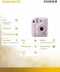 FUJIFILM Instax Mini 12 odličan je izbor za sve koji žele svoje uspomene imati odmah u ruci. Zahvaljujući jednostavnom upravljanju i pouzdanom instant ispisu, idealan je i za početnike i za kreativne entuzijaste. Stilsko pastelnoljubičasto izdanje naglasit će vaš jedinstveni stil.