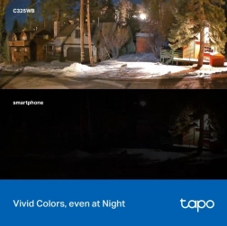 Zaštitite svoj dom danju i noću s vanjskom kamerom TAPO C325WB s tehnologijom ColorPro, koja pruža šarene snimke i pri vrlo slabom osvjetljenju bez potrebe za reflektorima. Nudi 2K QHD (2688 × 1520), objektiv F1.0 i veliki 1/1.79" senzor, pametno prepoznavanje osoba, životinja i vozila, IP66 otpornost na vremenske uvjete, široko vidno polje od 127° i izbor Wi‑Fi ili Ethernet povezivanja.