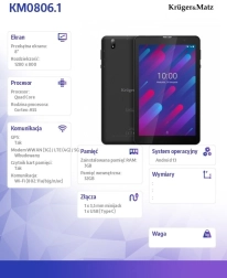 Tablet Kruger&Matz Eagle je idealan izbor za sve koji traže kompaktno i snažno uređaj. Zahvaljujući 8-inčnom IPS zaslonu s rezolucijom 1280 x 800 px i omjerom stranica 16:10 pruža oštar i svijetao prikaz, idealan za gledanje videa, surfanje webom ili čitanje knjiga.