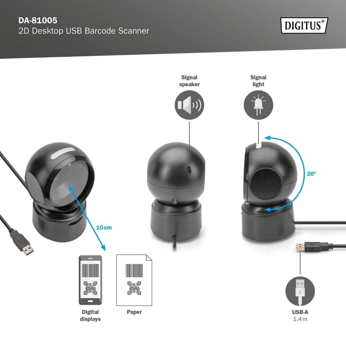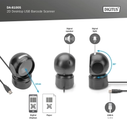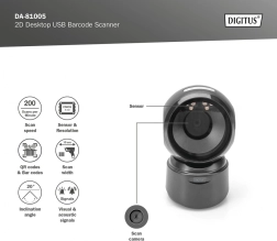 Automatski IR senzor aktivira skener čim je kod u vidnom polju, a vizualna i zvučna signalizacija potvrđuju uspješno očitanje. Anti-interference osigurava otpornost na ambijentalno svjetlo, dok okretna glava i kompaktno kućište štede prostor na stolu.