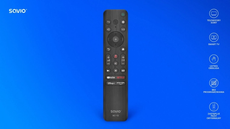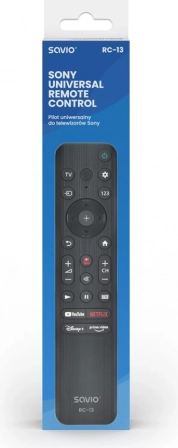 Daljinski upravljač Savio RC-13 idealan je za one koji trebaju jednostavno upravljati svojim Sony televizorom. Zahvaljujući unaprijed postavljenoj konfiguraciji i jednostavnoj upotrebi, dovoljno je umetnuti dvije AAA baterije i spremni ste upravljati svojim TV-om. Njegov intuitivan dizajn osigurava da su sve osnovne TV funkcije, poput promjene kanala, podešavanja glasnoće ili odabira ulaznog izvora, lako dostupne.