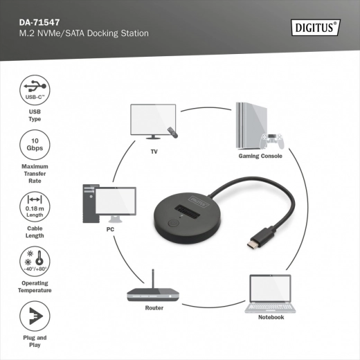 Proširite pohranu svojih uređaja pomoću priključne stanice DIGITUS za SSD M.2 NVMe i SATA s USB‑C 3.2 Gen2 sučeljem i brzinom prijenosa do 10 Gbps. Podržava kapacitet do 4 TB, formate 2242/2260/2280/22110 te funkcije UASP + TRIM za maksimalne performanse. Jednostavno Plug & Play bez upravljačkih programa za Windows i macOS.