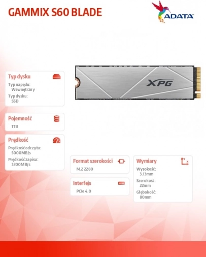 SSD XPG GAMMIX S60 BLADE donosi moderno spremište s PCIe Gen4 x4 NVMe sučeljem u formatu M.2 2280. Zahvaljujući brzinama čitanja do 5000 MB/s i zapisa do 4200 MB/s, značajno skraćuje učitavanje sustava, igara i aplikacija te poboljšava ukupnu odzivnost računala.