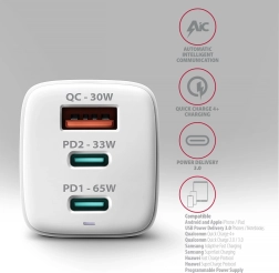 ACU-DPQ65W GaN 65W mrežni punjač, 3x port (USB-A + dualni USB-C) PD3.0/QC4+/PPS/Apple, bijela