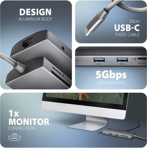 Čitač memorijskih kartica omogućuje istodobnu upotrebu SD i microSD te izravno kopiranje između utora. 3,5 mm audio konektor podržava slušalice sa stereo izlazom i mikrofon. Zahvaljujući aluminijskoj konstrukciji hub je izdržljiv i učinkovito se pasivno hladi. Dovoljno je priključiti – bez instalacije, s podrškom za Windows, macOS, Linux, Android i ChromeOS.