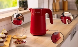 Stilsko električno kuhalo za vodu BOSCH MyMoment zapremnine 1,7 l u elegantnoj crvenoj boji idealno je za svakodnevnu upotrebu. Nudi praktično otvaranje poklopca pritiskom na gumb, pokazivač jedne šalice za uštedu vremena i energije, izvadivi filter protiv kamenca i čitljiv prozorčić razine vode. Za siguran rad brine se trostruki sigurnosni sustav s automatskim isključivanjem.
