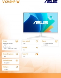 ASUS VY249HF-W je svestran monitor s 23,8" IPS panelom, pogodan za svakodnevnu upotrebu, online učenje i multimediju. Frekvencija osvježavanja 100 Hz i tehnologije za glatko prikazivanje osiguravaju udobno gledanje bez trzanja slike. Zahvaljujući IPS tehnologiji dobivate stabilne boje i široke kuteve gledanja.