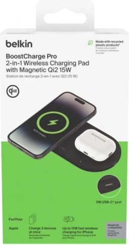 Uživajte u praktičnom i sigurnom punjenju bez kabela. Bežična podloga Belkin BoostCharge Pro Qi2 isporučuje vašem iPhoneu 15 W, slušalicama AirPods 5 W, a zahvaljujući USB‑C izlazu od 5 W nadopunit će energiju i dodatnom uređaju. Magnetna tehnologija Qi2 osigurava brzo i precizno poravnanje za pouzdano punjenje.
