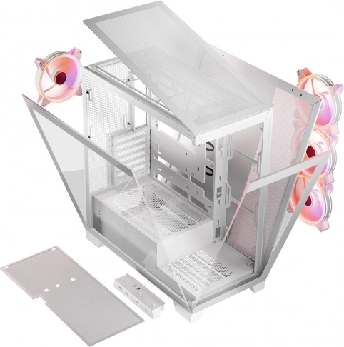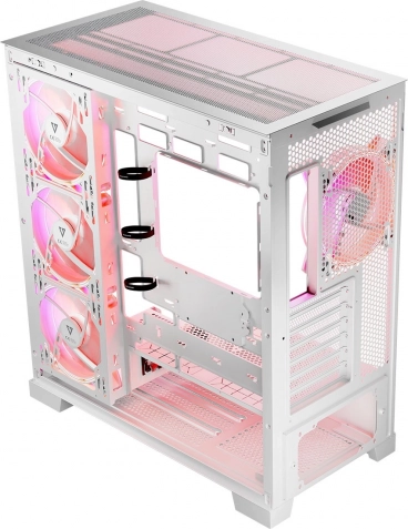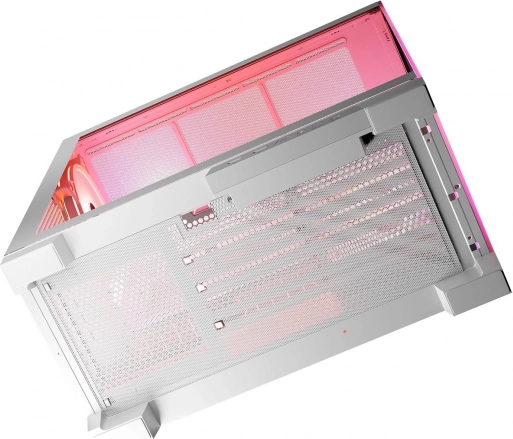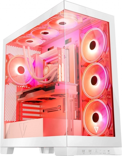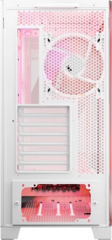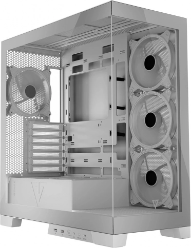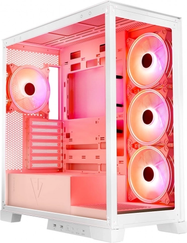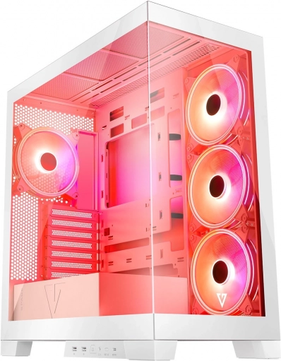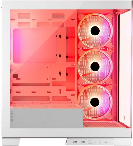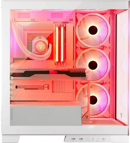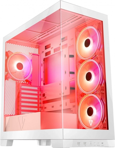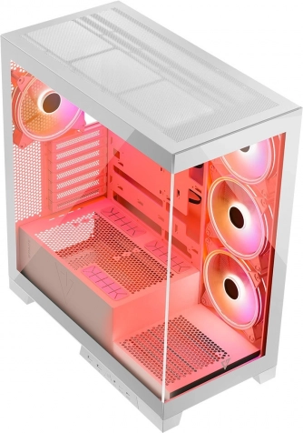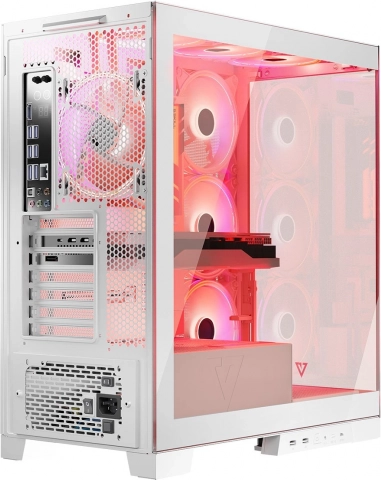 Volcano Space je bijelo mid‑tower kućište koje impresionira preglednim interijerom i dvama panelima od kaljenog stakla. Konstrukcija omogućuje montažu klasičnih ATX ploča i modernih modela sa stražnje izvedenim konektorima (npr. MSI Project Zero, ASUS B760M‑BTF). Tako lako skrivate kabliranje i maksimalno ističete svoje gaming komponente.