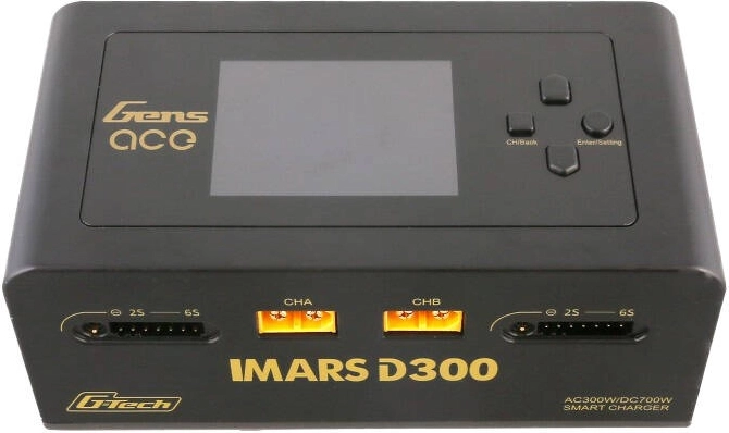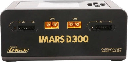 Gens Ace IMARS D300 G‑Tech je inteligentna AC/DC punjačica namijenjena za G‑Tech Eco baterije i standardne pakete. Automatski prepoznaje tip G‑Tech baterije, napon i preporučenu struju punjenja, pa je punjenje brzo, precizno i sigurno. Dva neovisna kanala omogućuju istodobno punjenje dviju baterija, i to snagom do AC 300 W ili DC 2×350 W.