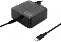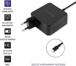 Mrežni punjač marke Qoltec snage 90 W. Ima ugrađeni kabel s konektorom USB Type‑C.