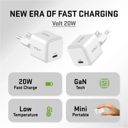 Ovaj bijeli VOLT punjač s inovativnom tehnologijom GaN (galijev nitrid) nudi povećanu učinkovitost i kompaktne dimenzije za svestranu upotrebu. Zahvaljujući ovoj tehnologiji, punjač je 30 % manji od tradicionalnih punjača, a pruža snagu do 20 W. Idealan je za putovanja ili kao rezervni punjač zbog svoje male mase i dimenzija.