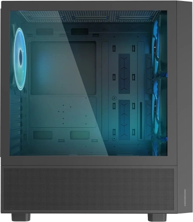 Bočna stranica od kaljenog stakla s klik-zasunima ubrzava pristup komponentama bez odvrtanja. Unutrašnjost prima hladnjak CPU-a do 175 mm i grafičku karticu do 330 mm (do 360 mm nakon uklanjanja prednjih ventilatora). Za pohranu je pripremljena košara u tunelu napajanja za 2 diska (SSD/HDD) te dodatna M.2 mjesta prema matičnoj ploči.