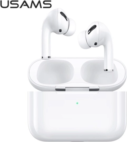 Bežične slušalice USAMS YS Series: Bluetooth 5.0, stabilna veza, automatsko uparivanje, dodirne kontrole i punjenje Qi i Lightning. Bijelo kućište.
