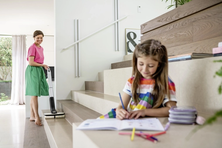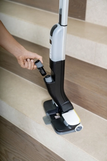 Bežični mop KÄRCHER FC 4-4 Battery Set spaja usisavanje i brisanje u jednom koraku – učinkovito uklanja suhe i mokre nečistoće, kosu i životinjsku dlaku. Nudi do 30 minuta rada, brzo punjenje i dvije razine doziranja vode za sve tvrde podne obloge. Zahvaljujući samostojećoj konstrukciji, higijenskom sustavu spremnika i jednostavnom održavanju idealan je za svakodnevno čišćenje cijelog doma.