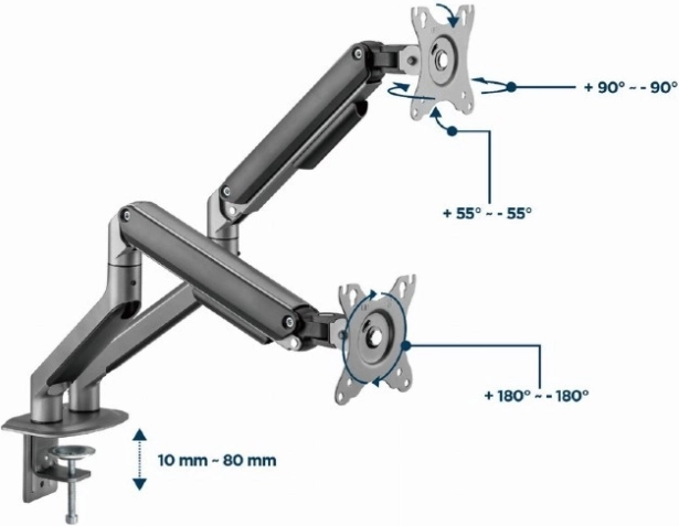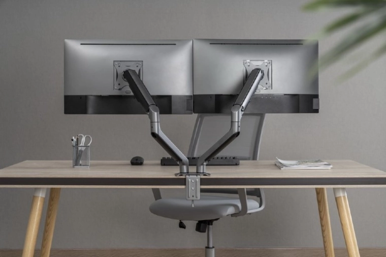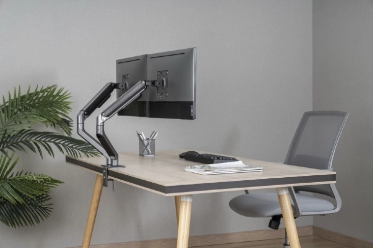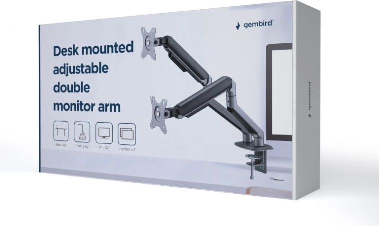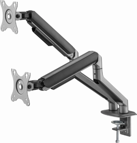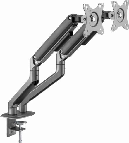 Povećajte udobnost i produktivnost s ovim stolnim nosačem za 2 monitora za dijagonale 17–32". Nudi glatko podešavanje zahvaljujući plinskim oprugama, okretanje, nagib i pivot u portret, čvrsto pričvršćivanje stegom ili provrtom te upravljanje kabelima za uredno radno mjesto. Nosivost po monitoru do 9 kg, kompatibilno sa VESA standardom 75 × 75 i 100 × 100.