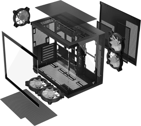 Model Volcano Panorama prati najnovije trendove prikaza ugrađenih komponenti. Jedna ploča od kaljenog stakla nije dovoljna – ovdje smo pripremili mogućnost punokrvnog prikaza računala. Skupi grafički adapteri, RAM moduli, hlađenje procesora – šteta ih je skrivati. Ako sastavljate računalo s pomno odabranim komponentama, znamo koliko vam je važno da ih možete izložiti dnevnom svjetlu. Pripremili smo nekoliko verzija modela, među ostalim s čak sedam, pet ili tri prethodno instalirana ventilatora, što vam daje široke mogućnosti konfiguracije. Odabirom Volcano Panorame dobivate prije svega mogućnost ugradnje matičnih ploča s obrnutim konektorima, dovoljno prostora za komponente – duge grafičke kartice i visoki hladnjak procesora, USB-C priključak i dva USB 3.0 priključka te dvokomornu izvedbu u kojoj je vertikalno postavljeno napajanje odvojeno od montažnog dijela. Sve je zatvoreno u dvije staklene ploče za najbolji mogući efekt.