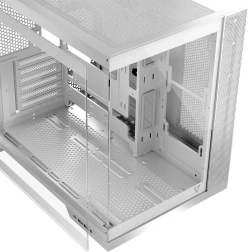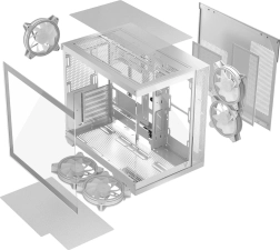Dvo‑komorno rješenje s okomito smještenim napajanjem odvaja servisni dio, što poboljšava upravljanje kabelima i estetiku. Kućište je spremno za ploče ATX / mATX / ITX kao i moderne ploče s okrenutim konektorima, nudi prostor za grafičke kartice do 400 mm i CPU hladnjake do 175 mm te podržava vodeno hlađenje s radijatorima 360 mm gore i dolje.