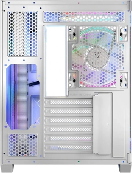 Stilno bijelo miditower kućište s panoramskim kaljenim staklom nudi 7× predinstaliranih ARGB ventilatora i priložen kontroler za do 9 ventilatora. Dvokomorna konstrukcija s podrškom za ploče s obrnutim konektorima, vrhunski protok zraka, prostor za GPU do 400 mm i hladnjak CPU do 175 mm te podršku za radijatore 360 mm gore i dolje. Tu su i USB‑C, filteri protiv prašine i bočne stranice bez vijaka na klik.