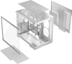 Stilno bijelo kućište s kaljenim staklom sa strane i sprijeda, dvo-komornom konstrukcijom i podrškom za ploče s obrnutim konektorima. Nudi USB‑C, prostor za radijatore 360 mm, grafičke kartice do 400 mm i CPU hladnjak 175 mm. U paketu je ARGB kontroler za do 9 ventilatora; kućište je bez predinstaliranih ventilatora za vlastitu konfiguraciju protoka zraka.