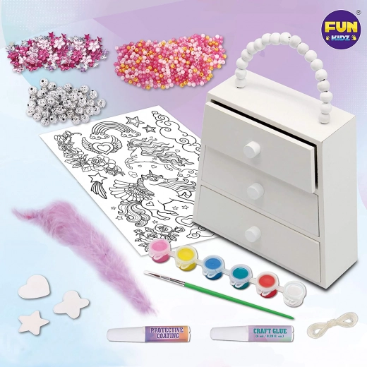 S ovim kreativnim setom kreirat ćete vlastitu drvenu kutiju za nakit, koju možete ukrasiti prema svom ukusu. Savršen način za čuvanje svih vaših dragocjenosti na jednom mjestu.