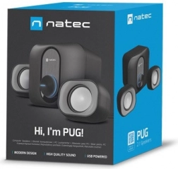 Zvučnicima Natec PUG nisu potrebni nikakvi driveri ni adapteri te počinju raditi odmah nakon povezivanja na USB i 3,5 mm priključak. Kontrola glasnoće lako je dostupna putem regulatora na subwooferu, uz osvjetljenje za bolju vidljivost i noću.