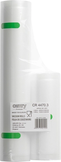 Folija za vakuumske brtvene uređaje Camry CR 4470, Adler AD 4484, MS 4492, koja se može koristiti i u drugim brtvenim uređajima sličnih dimenzija. Folija za vakuumsko skladištenje hrane zahvaljujući kojoj proizvodi znatno dulje zadržavaju svježinu. Hermetičko pakiranje s izvlačenjem zraka omogućuje dulje čuvanje proizvoda u hladnjaku ili zamrzivaču. Može se koristiti u mikrovalnoj pećnici i pogodna je za Sous Vide kuhanje. Osim za hranu, folije možete koristiti i za zaštitu sitnih predmeta, poput kovanica, od vlage i prašine. Folije su idealne za kućnu i profesionalnu uporabu.
