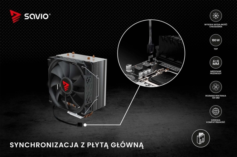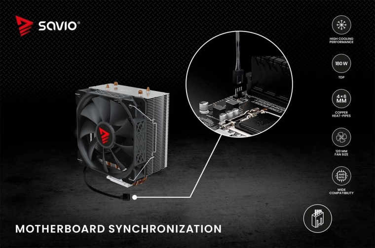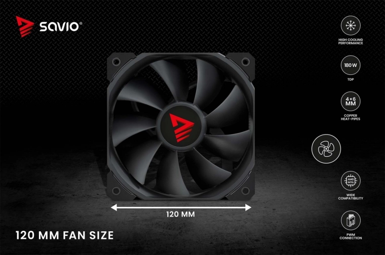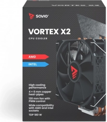 Hladnjak Savio Vortex X2 posjeduje četiri bakrene heatpipe cijevi koje učinkovito odvode toplinu s površine procesora u aluminijski hladnjak.