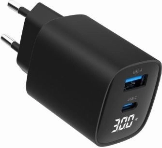 GaN brzi punjač 30 W s USB‑C i USB‑A, LCD zaslon, crni