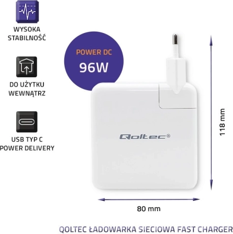Punjač Qoltec opremljen je najsuvremenijom tehnologijom Power Delivery, koja se prilagođava priključenom uređaju i precizno postavlja maksimalni napon i struju. S snagom 96W univerzalan je i može se koristiti za razne uređaje.