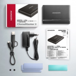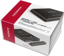 AXAGON CLONE MASTER 2 praktično je rješenje za sigurnosno kopiranje, migraciju i testiranje diskova. Zahvaljujući brzom sučelju USB 3.2 Gen 2 (10Gbps) i stvarnoj propusnosti oko 1 000 MB/s omogućuje brzi prijenos podataka. NVMe M.2 disk umetnete bez vijaka, 2.5"/3.5" SATA diskove priključite izravno u SATA port na adapteru. Smjer kloniranja može se prekidačem mijenjati između NVMe M.2 → SATA i SATA → NVMe M.2.
