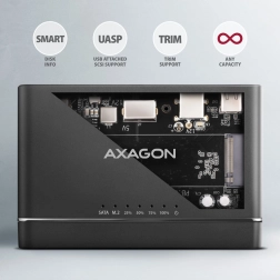 Za stabilan rad sa SSD‑ovima dostupne su tehnologije UASP za veće performanse, TRIM za dugoročnu kondiciju i S.M.A.R.T. nadzor. Adapter podržava boot s povezanih diskova, Auto Spindown pri neaktivnosti i Turn Off nakon odspajanja ili uspavljivanja PC‑a. Napajanje preko USB‑a dovoljno je za M.2 i 2.5" diskove, za 3.5" HDD u pakiranju je vanjski 12 V / 2 A adapter.