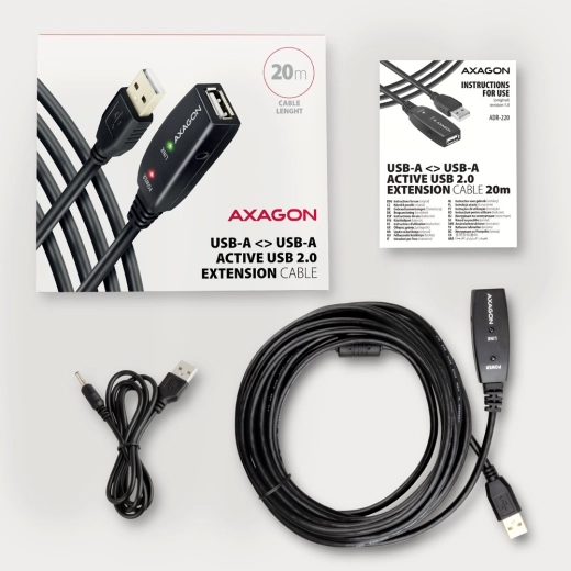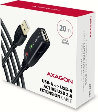 Axagon USB 2.0 aktivni produžni kabel duljine 20 metara namijenjen je produženju USB veze između računala i uređaja poput miša, tipkovnice, web kamere, pisača ili skenera. Kabel sadrži integrirani repetitor koji pojačava prenošeni signal, što omogućuje upotrebu kabela na većim udaljenostima.
