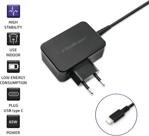 QOLTEC mrežni punjač usb‑c 65 W s power delivery i quick charge, crna