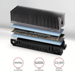 Hladnjak je kompatibilan s utorima M.2 (NGFF) na matičnim pločama i s adapterima, podržava module SATA (AHCI) i NVMe (PCIe) u formatu 2280. Zahvaljujući robusnoj izvedbi i velikoj kontaktnoj površini može smanjiti temperaturu do 30 °C, što eliminira thermal throttling, stabilizira brzine i produljuje vijek trajanja SSD-a.