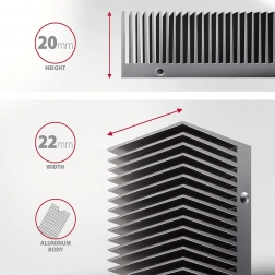 Održavajte svoj M.2 SSD na optimalnoj temperaturi i bez gubitka performansi. Aluminijski hladnjak s poprečnim rebrima i metalnim okvirom povećava površinu za odvođenje topline te zahvaljujući termalno vodljivim podloškama učinkovito hladi jednostrane i obostrane diskove. Kompaktna konstrukcija s ukupnom visinom od 24 mm omogućuje ugradnju i u skučenim prostorima, primjerice u kućištima s ograničenom visinom iznad utora.