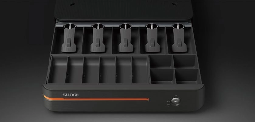 Zahvaljujući promišljenom unutarnjem rasporedu, SUNMI MAX nudi 5 pretinaca za novčanice, 4 fiksna i 6 iznimljivih pretinaca za kovanice te prednji ubac za medije (računi, kuponi). Ladić je kompatibilan s više od 20 valuta. Izdržljiva konstrukcija od nehrđajućeg ABS-a s trapezoidnim okvirom i unutarnjim saćem nosi do 10 kg i testirana je na 1 000 000+ ciklusa.