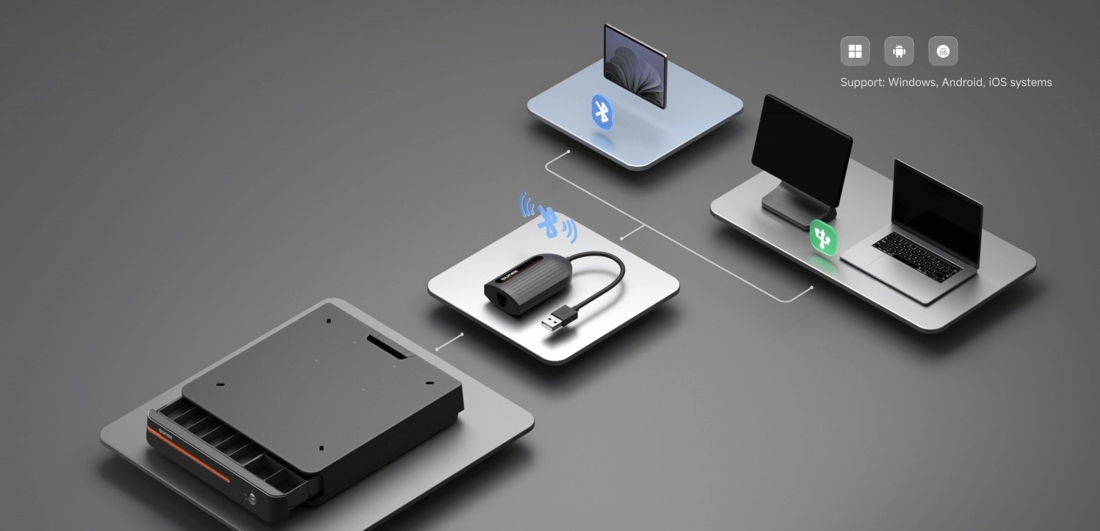Blagajnički ladić SUNMI MAX dizajniran je za brz i nesmetan rad u svim tipovima poslovanja. Otvaranje je moguće izravno okidačem ladice ili preko USB-a i Bluetootha, pa radi i bez dediciranog POS-a. Stražnje vođenje kabela održava red na pultu, a skriveni klizači s izdržljivim valjcima osiguravaju tiho i glatko otvaranje i zatvaranje.