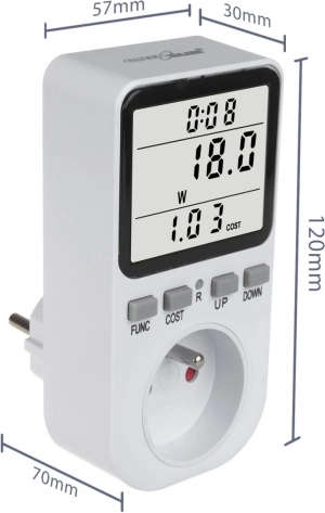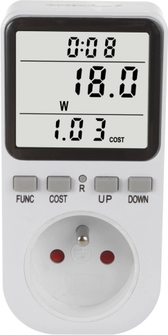 Ovaj mjerač opremljen je s četiri velika gumba za jednostavnu upotrebu i alarmom preopterećenja koji vas upozorava kada torba prijeđe sigurnosni prag od 3680W. Jasan ekran omogućuje lako čitanje podataka kao što su količina potrošene energije i njeni troškovi, što pomaže učinkovitom nadziranju i kontroli vaših troškova za električnu energiju.