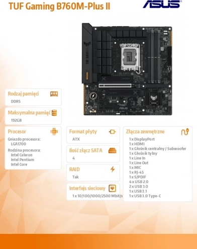 ASUS TUF Gaming B760M‑PLUS II koristi mogućnosti Intel procesora za ležište LGA1700 i donosi uravnoteženu kombinaciju gaming funkcija, izdržljivosti i jednostavne izrade. Zahvaljujući pojačanom napajanju, kvalitetnim hladnjacima i strogim stres testovima, ploča je spremna za duge gaming maratone bez kompromisa u stabilnosti.