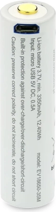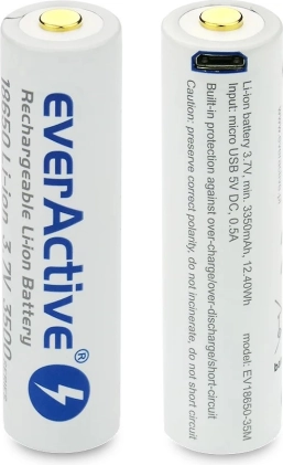 Akumulator EverActive 18650 kapaciteta 3500 mAh idealan je za profesionalnu uporabu, zahvaljujući integriranom micro USB priključku za izravno punjenje. Ovaj akumulator opremljen je originalnom ćelijom Samsung 35E i pruža elektroničku PCM zaštitu koja štiti od prekomjernog pražnjenja, prepunjavanja i kratkog spoja.