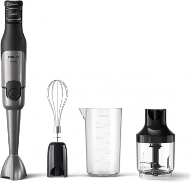 Snažan ručni mikser PHILIPS iz serije 5000 s učinkom 1200 W savladava i najtvrđe sastojke. Zahvaljujući tehnologiji ProMix nudi brzo i ujednačeno miksanje bez prskanja, glatko upravljanje SpeedTouch i praktičan pribor uključujući sjeckalicu 0,5 l, metlicu za tučenje i mjericu.