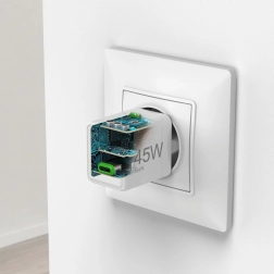GaN tehnologija omogućuje minimiziranje proizvodnje topline, što osigurava učinkovito i sigurno punjenje. Punjač je također opremljen inteligentnim čipsetom koji štiti od prenapona i kratkih spojeva.